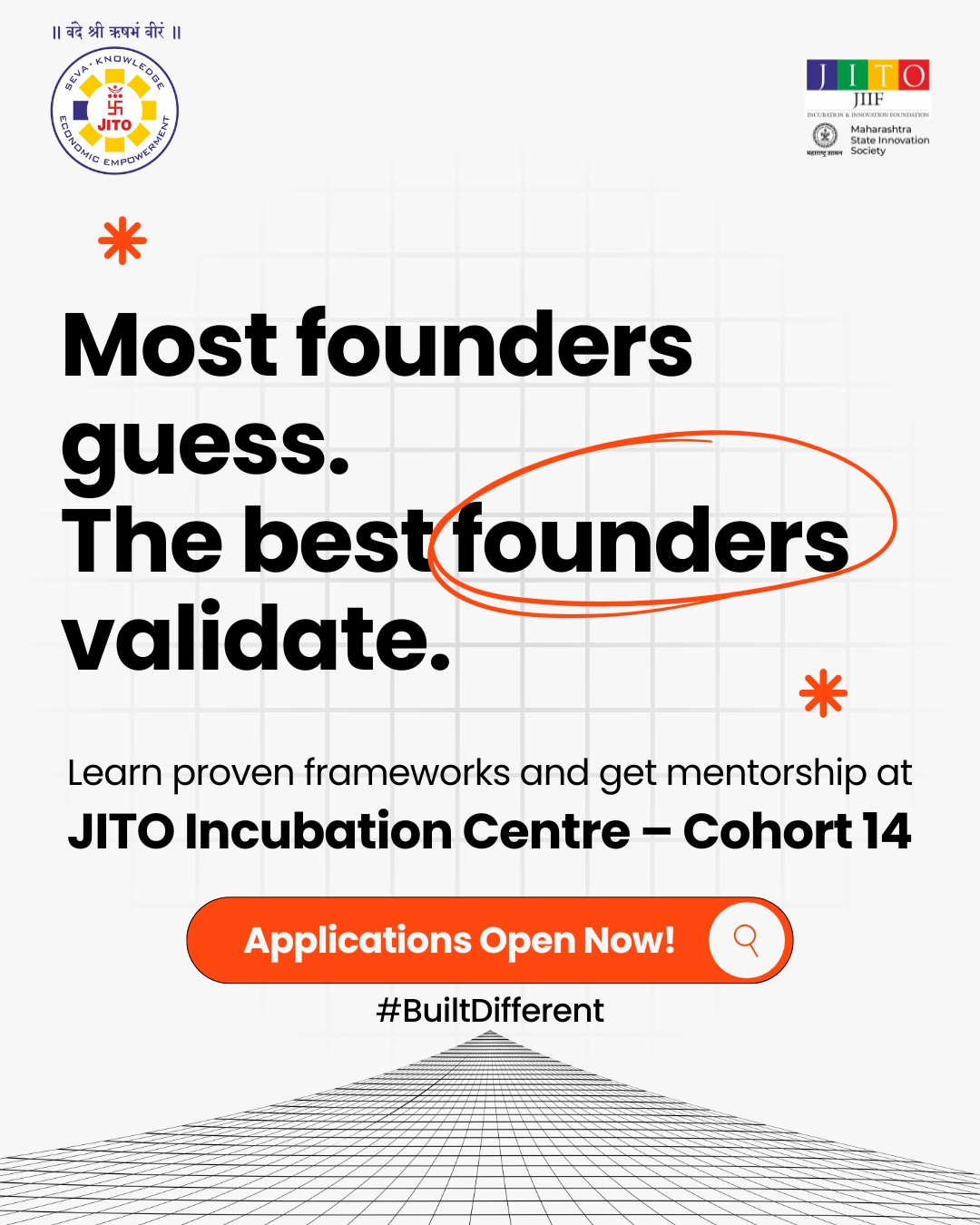At the JITO Incubation Centre, we help founders move from assumptions to action. Cohort 14 is built for those who want to test, refine, and scale their ideas with expert guidance. ✅ Learn proven startup frameworks ✅ Validate your business model with real feedback ✅ Get mentored by top founders, investors & leaders ✅ Access funding, networks & growth opportunities Don’t just build — validate and grow smarter. 🔸 Applications for Cohort 14 are now open! https://incubation.jitojiif.com/entrepreneur/signup/MQ== Deadline – 30th Nov 2025 #BuiltDifferent Regards, JITO Incubation Centre | Supported by Startup India Seed Fund Scheme (SISFS) and Maharashtra State Innovation Society (MSInS)